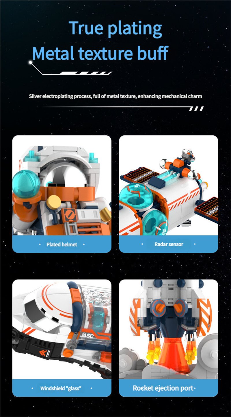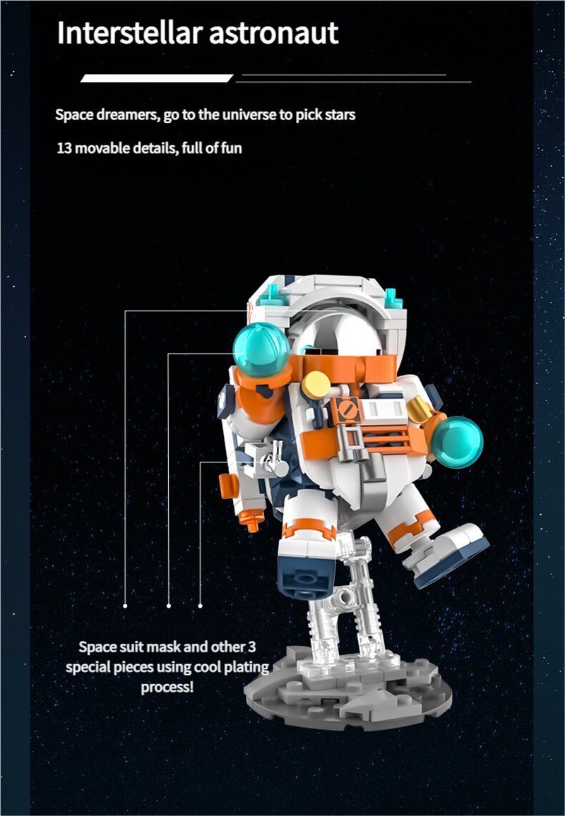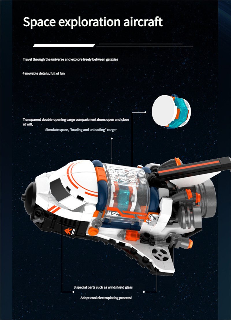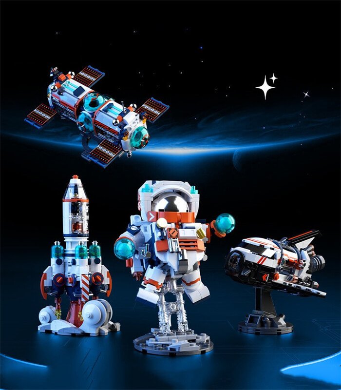 Product Includes: This space building set includes four separate pieces: an interstellar astronaut, a galactic space station, a space exploration shuttle, and a space moon rocket, along with four instruction manuals.