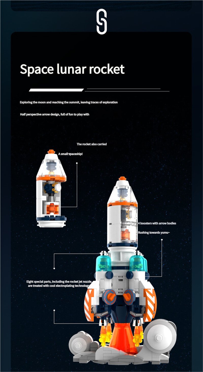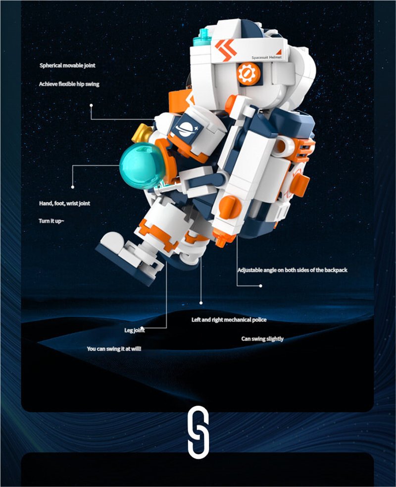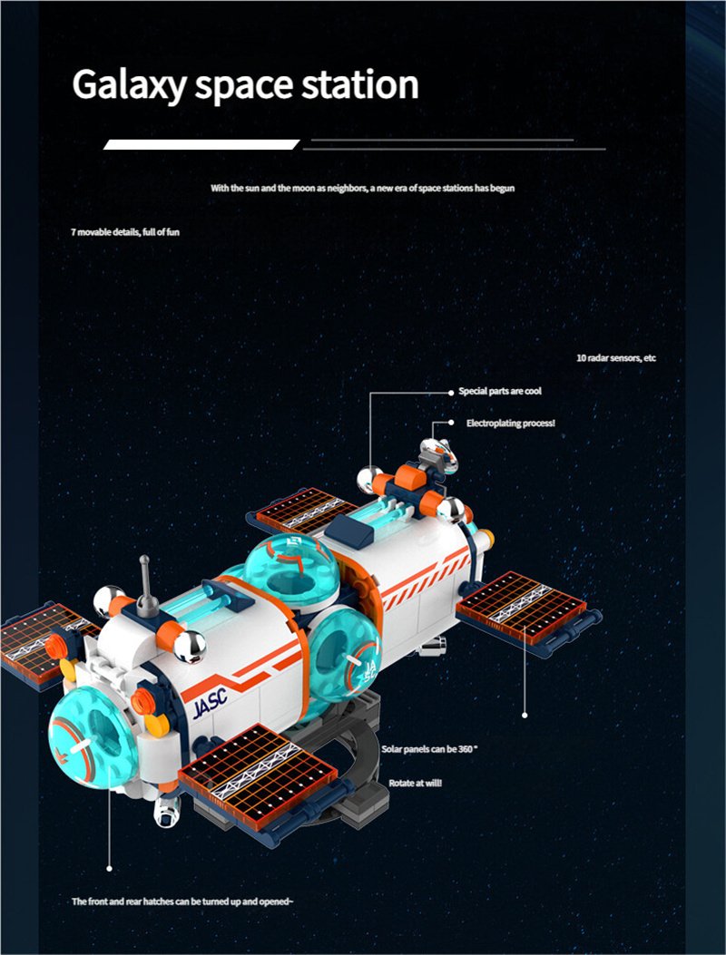 Product Includes: This space building set includes four separate pieces: an interstellar astronaut, a galactic space station, a space exploration shuttle, and a space moon rocket, along with four instruction manuals.
