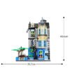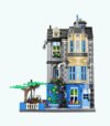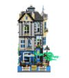 The Modular Garden Cafe Building Blocks Toy Building Set is a great addition to any city-themed building block collection. It has three floors with a side garden complete with a float and parasol, and street lights on the sidewalk. The window details and vines growing on the side of the building add to the charming look.