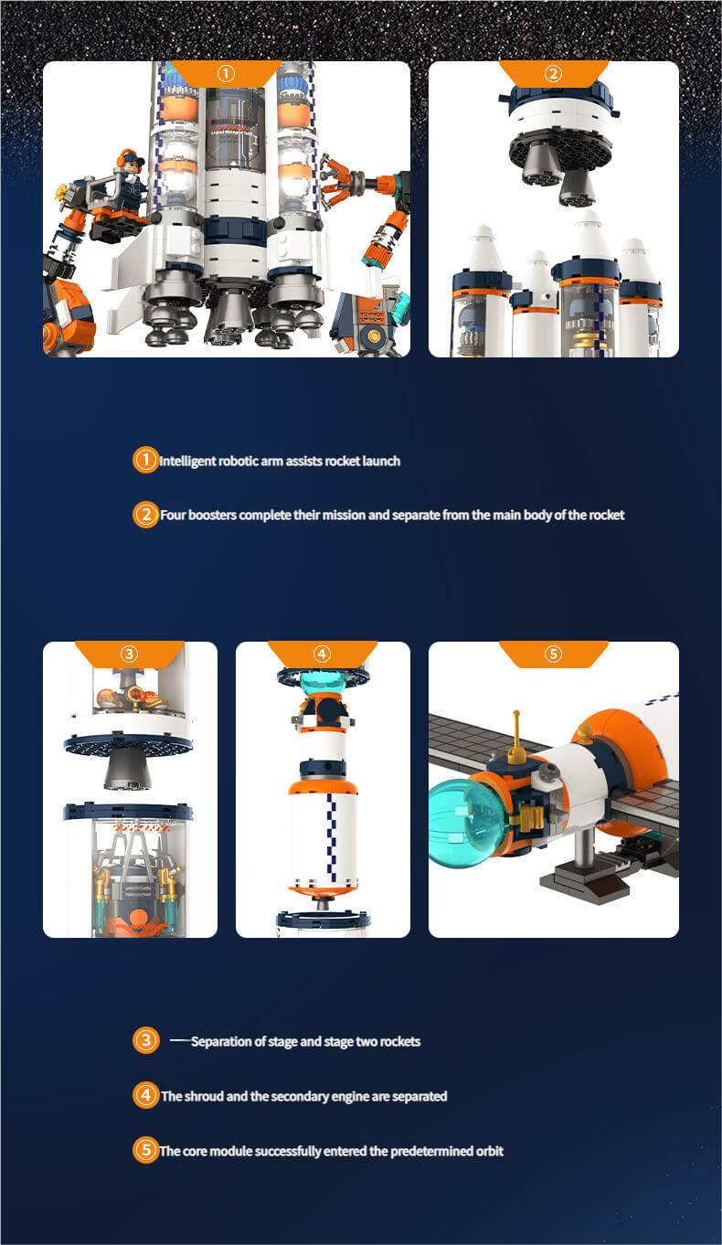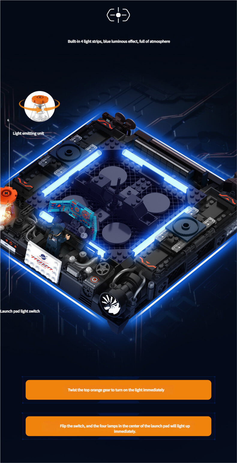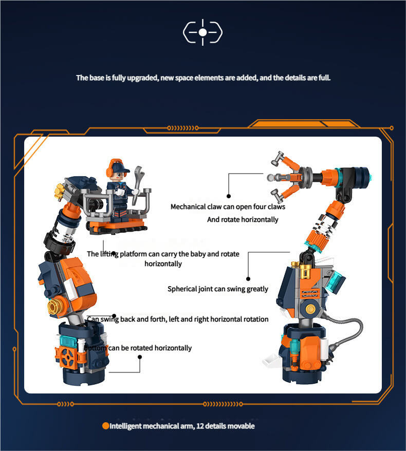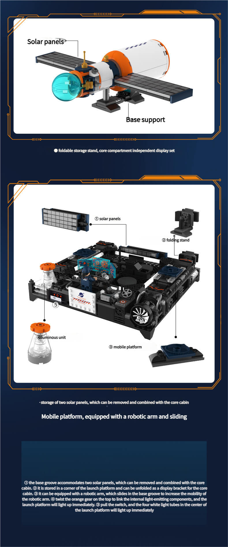 The unique design features a robotic arm on the rocket body, adding a touch of technology. The included solar panels create a detailed display and offer a variety of exciting play options. The core module can be mounted on a launch pad, and the solar panels can be integrated with the core module platform. The sliding robotic arm also adds to the cool, new lighting creates a strong space atmosphere.