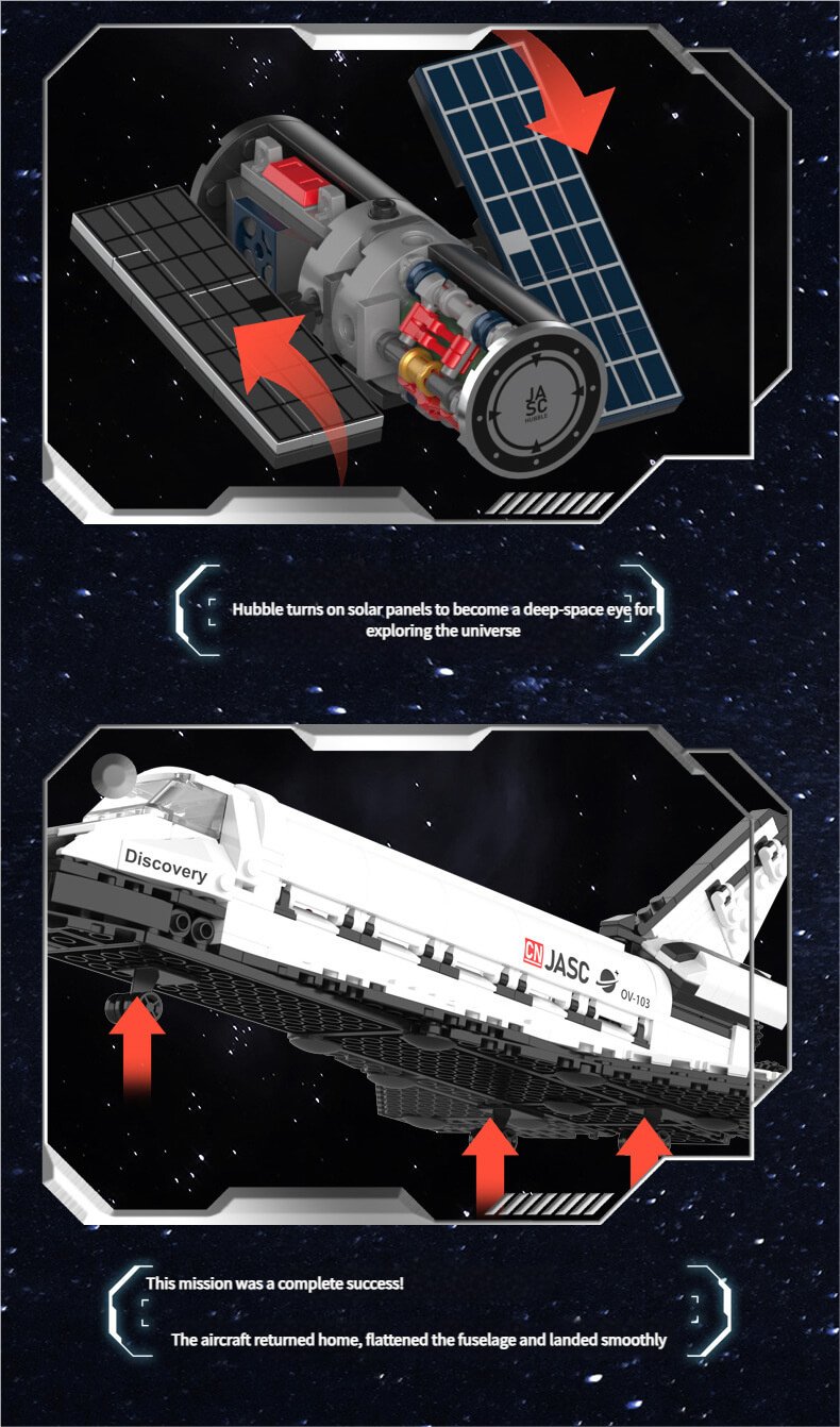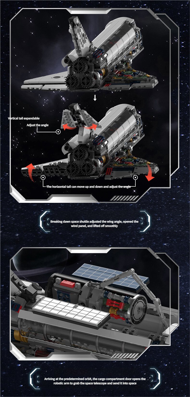 Rich details: the space ship is equipped with a sturdy launch ramp, energy transmission pipes and fire panels. The satellite’s hatch slats and solar panels are movable and equipped with brackets for flexible angle adjustment.